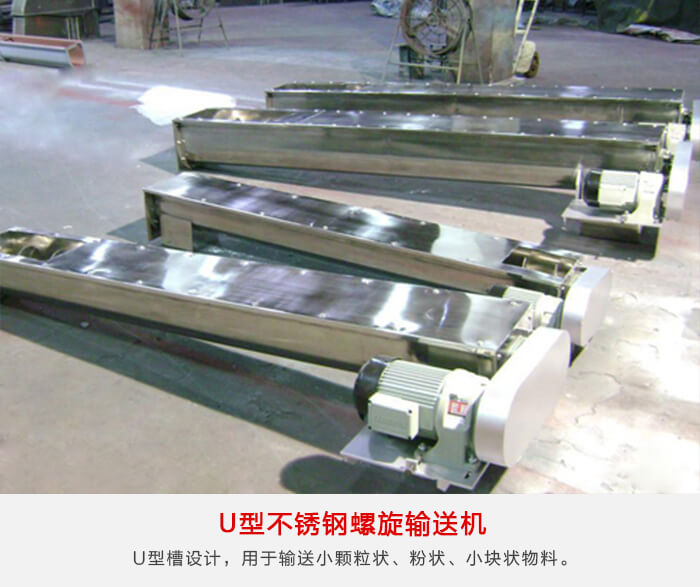 為U型槽設計,用于輸送小顆粒狀、粉狀、小塊狀物料。不適宜輸送易變質、黏性較大易結塊以及含水量較大的物料,每小時輸送量在9-134噸之間,U型不銹鋼螺旋輸送機具有密封性好、承載轉距大、噪音低、不滲油等顯著特點。