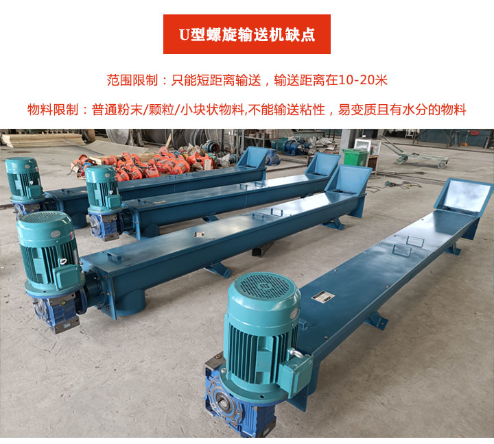 輸送范圍限制:U型螺旋輸送機只適合短距離輸送作業,其輸送距離在10-20米,且輸送傾角不能超過15°;如果長距離輸送物料,會把易碎物料擠壓破壞,不能確保物料完整性。