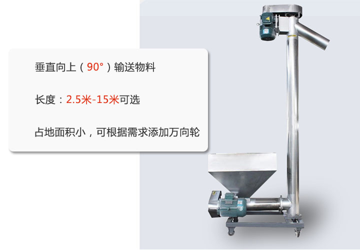 垂直螺旋輸送機用于解決需要垂直向上(90°)輸送物料的難題,其長度2.5米-15米,大家可根據需要選擇長度;相比普通螺旋輸送機,該款設計更好的節約了占地面積,也可根據場地需要添加移動輪,方便來回移動。