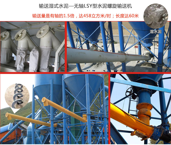 潮濕的水泥含水量偏大,且易粘黏,選擇無軸式水泥螺旋輸送機,采用無螺旋軸,只含螺旋葉片的設計理念,可避免輸送中物料堵塞,卡料等現像;而且無軸設計其輸送量是有軸的1.5倍,高達458立方米/時;長度達60米,可多級串聯,遠距離輸送物料。