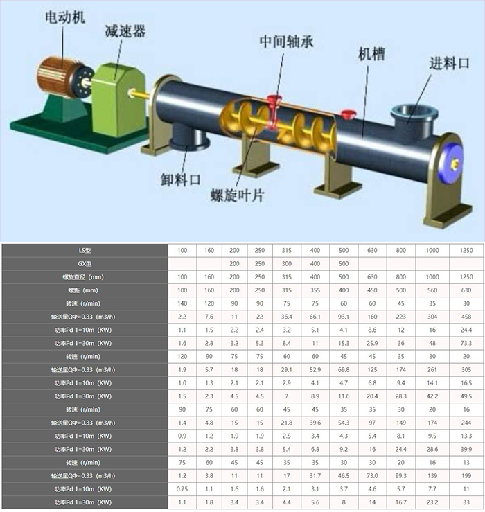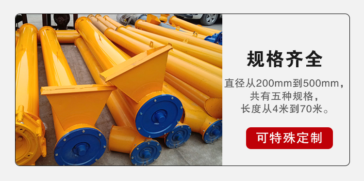 螺旋直徑從 200 毫米到 500 毫米,共有五種規(guī)格,長(zhǎng)度從 4 米 到 70 米 ,每隔 0.5 米一檔,選型時(shí)符合標(biāo)準(zhǔn)公稱長(zhǎng)度,特殊需要可在選配節(jié)中另行提出。