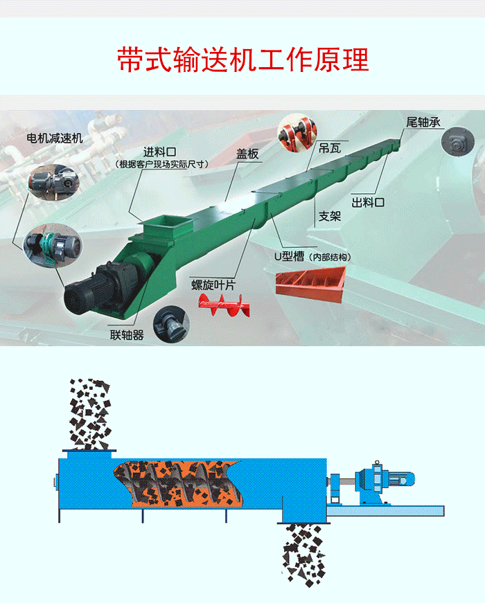 帶式螺旋輸送機(jī)也是借助螺旋軸和葉片,進(jìn)行對物料進(jìn)行推送的輸送設(shè)備。該機(jī)所選的輸送帶有普通橡膠和塑料帶兩種,可用于水平或傾斜輸送,傾斜向上輸送時不同物料所允許傾角不同。